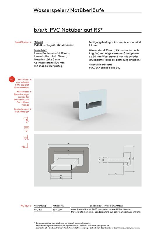 b/s/t PVC Notüberlauf RS, mit hoher Ablaufleistung b/s/t PVC Notüberlauf RS, mit rechteckigem Querschnitt und hoher Ablaufleistung, aus schlagzähem PVC-U, UV-stabilisiert, mit Grundplatte, zur Freispiegelentwässerung, Abmessungen in gewünschten Sondermaßen*, Wandstärke 5 mm, Rohr und Grundplatte PVC-verschweißt, Einbauhöhe (Notüberlauf) gemäß Vorgabe, Grundplatte auf Wunsch abgewinkelt, inklusive werkseitig angeschlossener, systemgerechter Anschlussmanschette (PVC, EVA) entsprechend Dachdichtungsbahn, liefern und fachgerecht einbauen. Anschluss an Bitumenbahn mittels werkseitig angeschlossener, bitumenverträglicher PVC-Manschette.