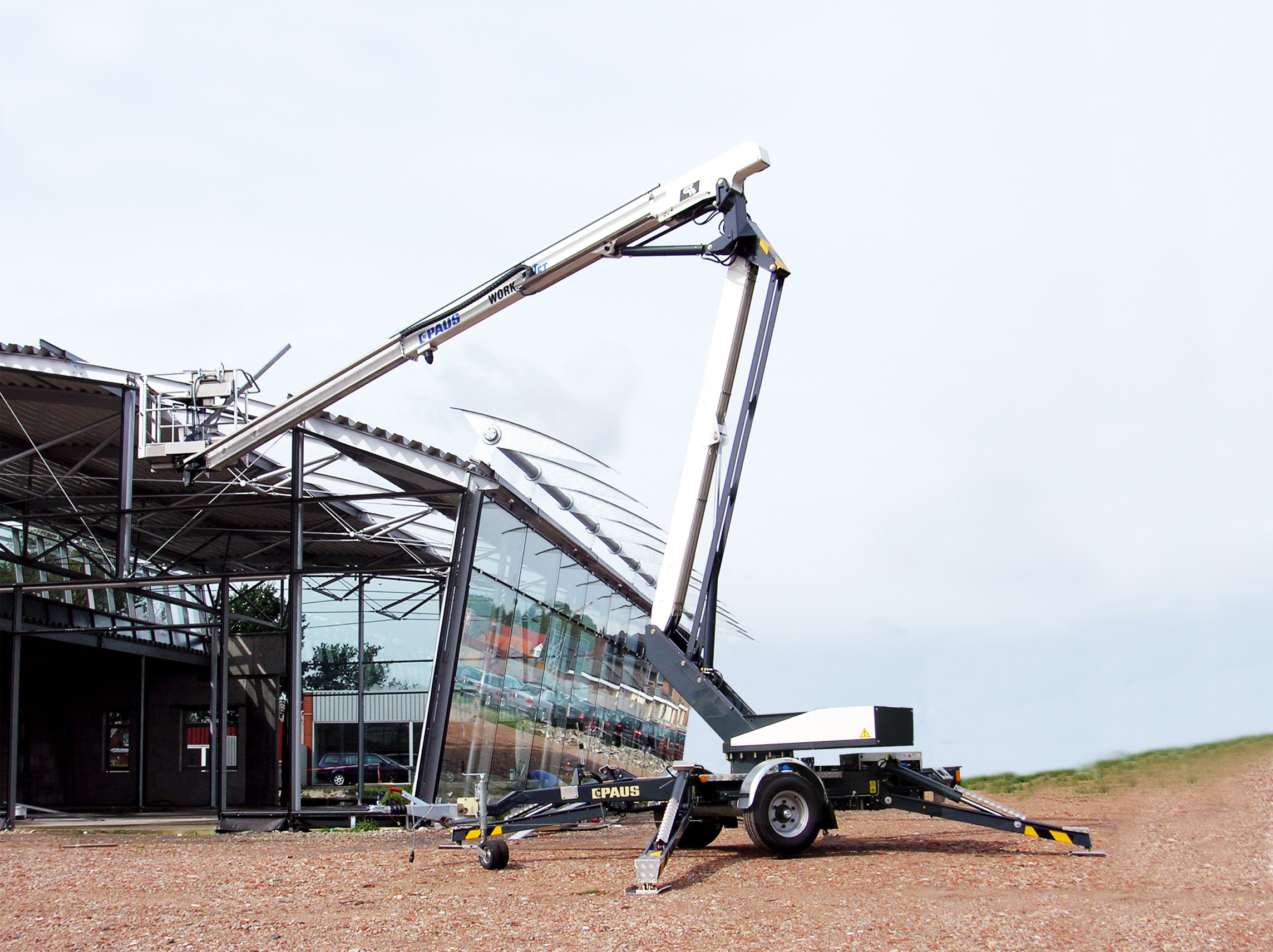 Der Aufzug überzeugt durch eine sehr kompakte und zugleich robuste Bauweise. Mit einer schmalen Durchfahrbreite von nur 1,36 m passt der Paus Easy 18 auch in Innenhöfe. Die Aufstellfläche ist aufgrund der klappbaren Deichsel minimal. Dank X-Abstützung bietet der Easy 18 hohe Standsicherheit sowie große seitliche Reichweite.