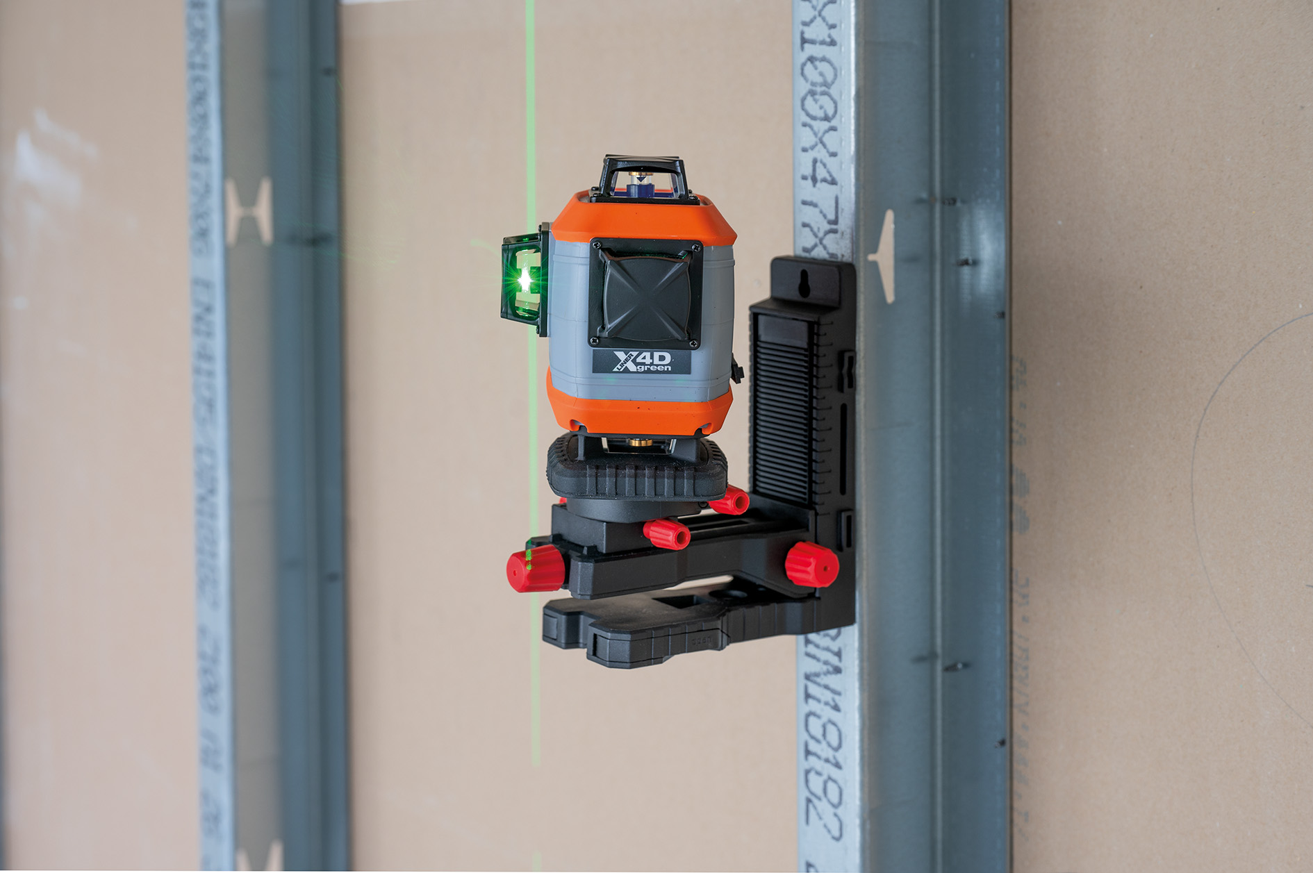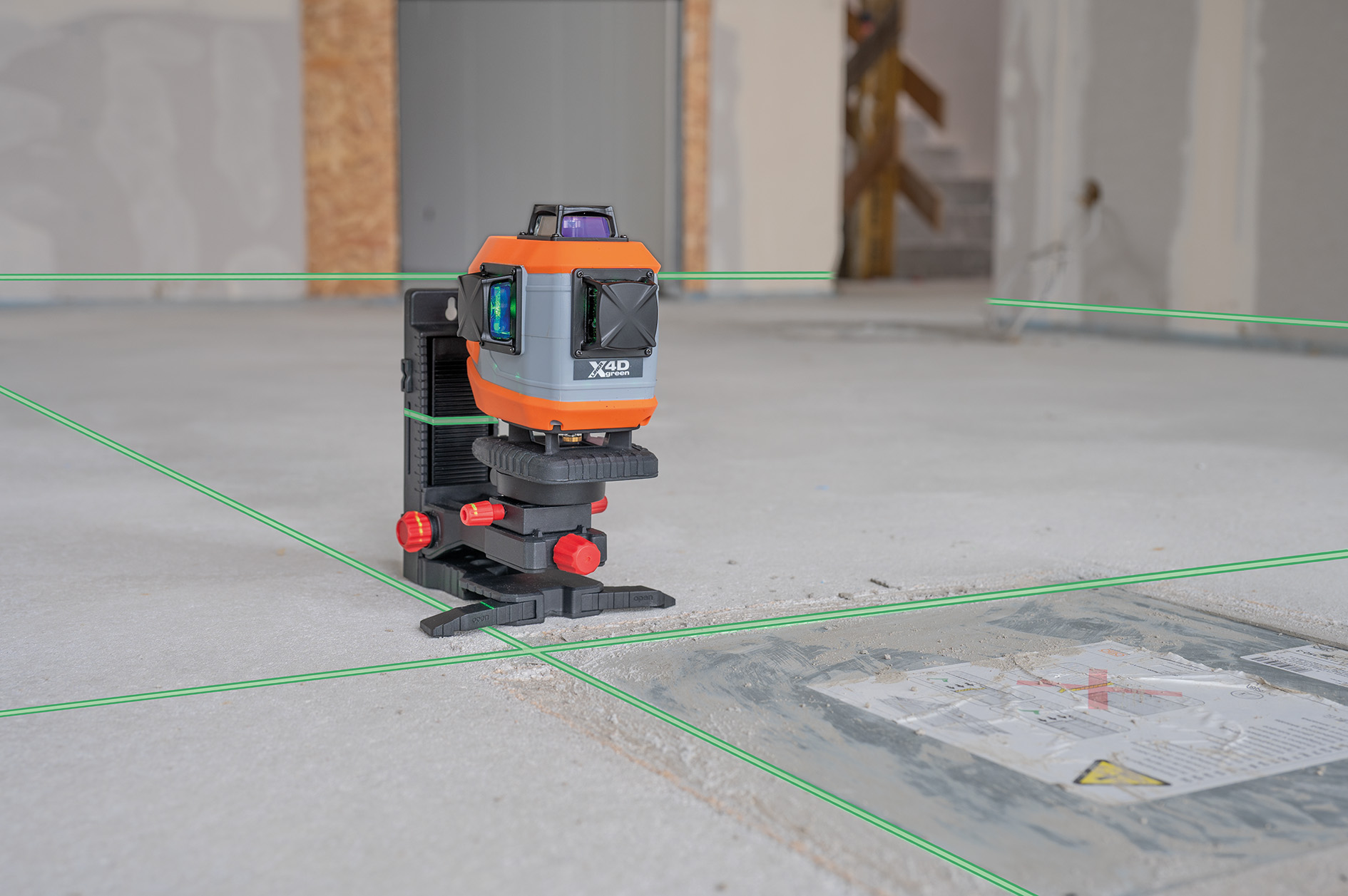 Dank der zusätzlichen horizontalen Laserlinie am Gehäuseboden ist der neue X-Liner 4D green besonders gut für bodennahe Arbeiten geeignet. Die grünen, sehr gut sichtbaren Laserlinien und die robuste Selbstnivellierung ermöglichen ein schnelles und unkompliziertes Nivellieren, Fluchten, Loten und Abtragen rechter Winkel im Innenausbau.