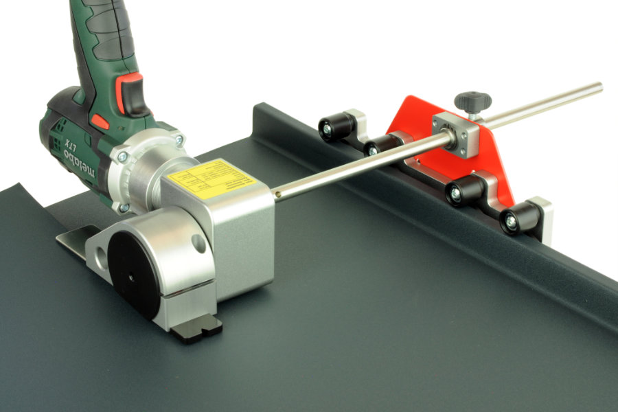 - Ausgestattet mit einem Rädergestell zum raschen, problemlosen Zuschneiden am Boden liegender langer Blechbahnen