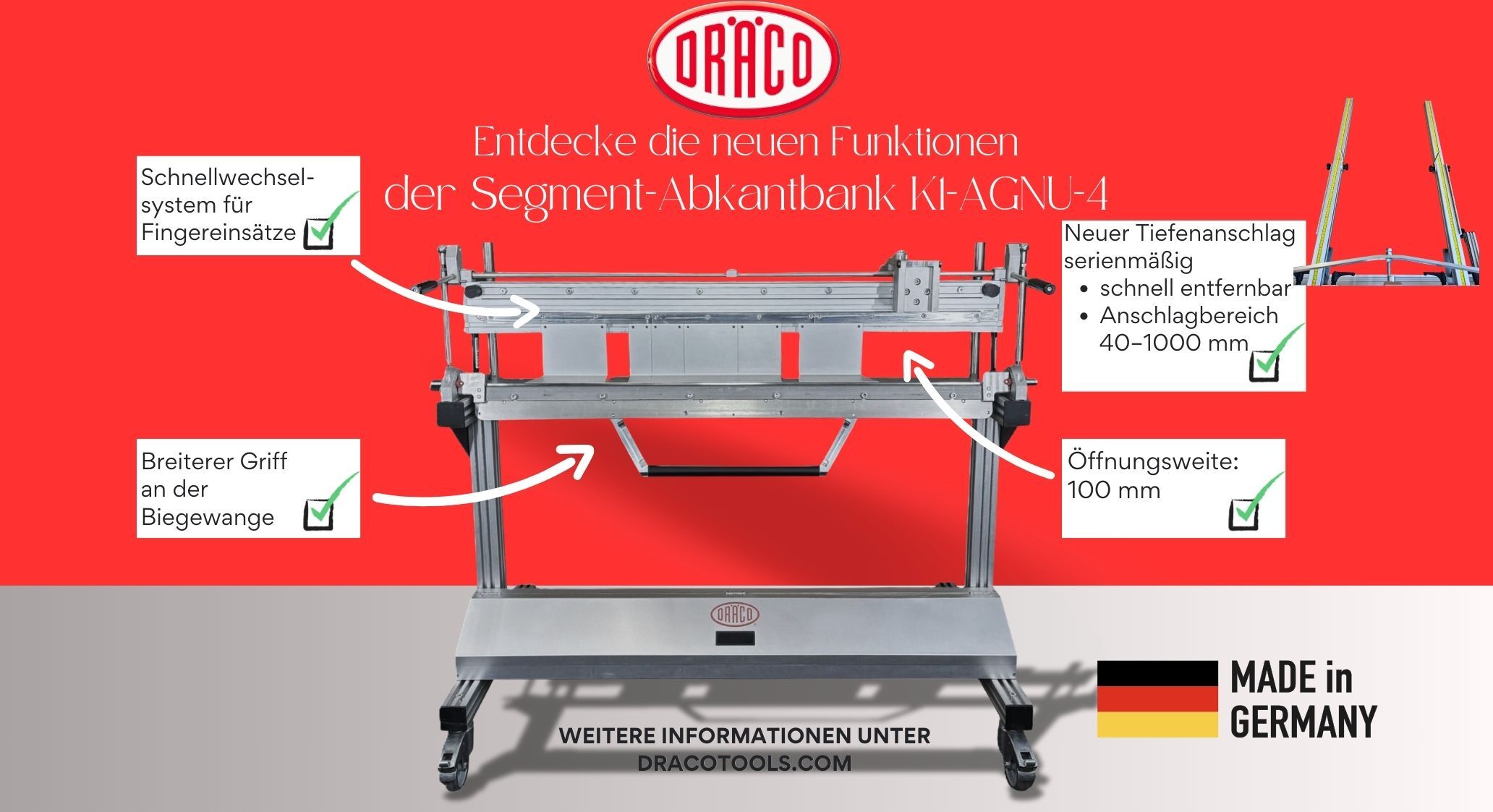 Unsere neue mobile Segmentabkantbank K1-AGNU-4. Besser als jemals zuvor. Schaut sie Euch an und lasst Euch begeistern von den neuen Möglichkeiten! Vollständig in Deutschland hergestellt wird sie standard inklusive Tiefenanschlag 40 -1000 mm ohne Aufpreis geliefert.