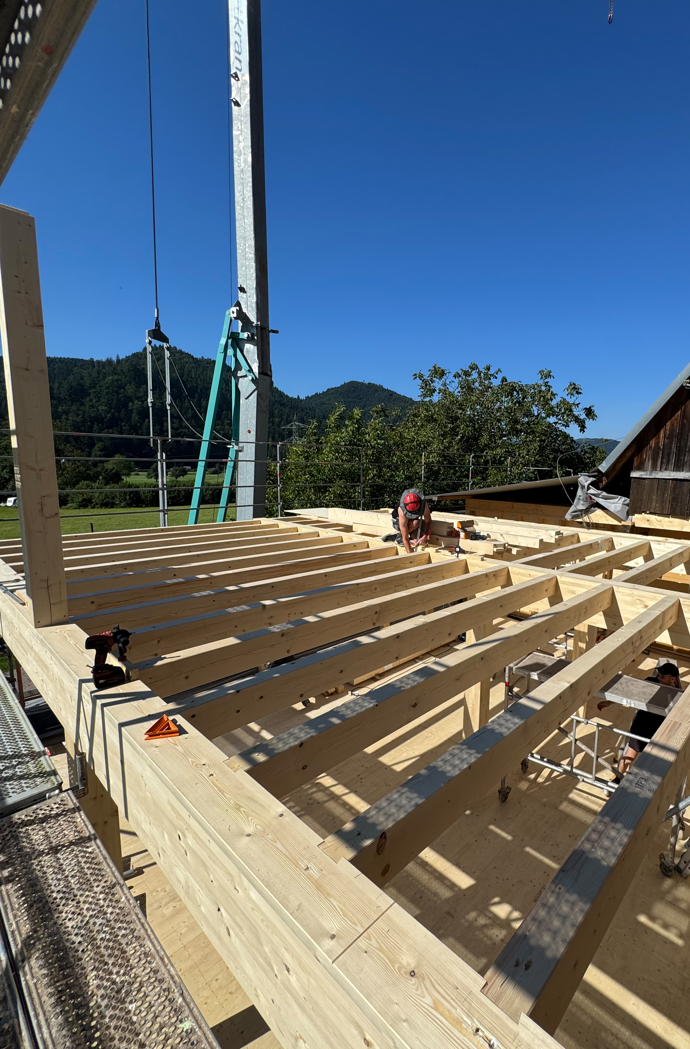 Auch im neuen Anbau über dem ehemaligen Schweinestall kamen die Schrauben zum Einsatz: Die Nebenträger wurden über Hilfslatten vorfixiert und anschließend mit den CombiConnect Schrauben kraftschlüssig verbunden. So konnte die neue Balkenlage präzise und zügig errichtet werden, ohne das historische Tragwerk zu beeinträchtigen.